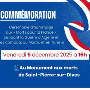 Dans le cadre de la Journée nationale d’hommage aux « morts pour la France » pendant la guerre d’Algérie et les combats du Maroc et de la Tunisie, une cérémonie (dépôt de gerbe) aura lieu au Monument aux morts de Saint-Pierre-sur-Dives le 𝘃𝗲𝗻𝗱𝗿𝗲𝗱𝗶 𝟓 𝐝𝗲́𝐜𝐞𝐦𝐛𝐫𝐞 𝟐𝟎𝟐𝟱 𝗮̀ 𝟏𝟔𝐡𝟬𝟬.