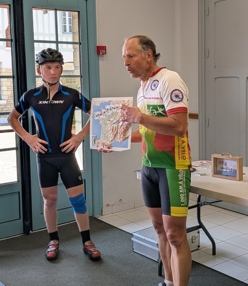 Jeudi 6 août 2025 en fin d’après-midi, Guillaume Chartier a fait une halte à Saint-Pierre-sur-Dives dans le cadre de son périple « 𝟭𝟬𝟬𝟬 𝗸𝗺 à 𝘃é𝗹𝗼 𝗰𝗼𝗻𝘁𝗿𝗲 𝗹𝗲𝘀 𝗺𝗮𝗹𝗮𝗱𝗶𝗲𝘀 𝗰𝗵𝗿𝗼𝗻𝗶𝗾𝘂𝗲𝘀 ».